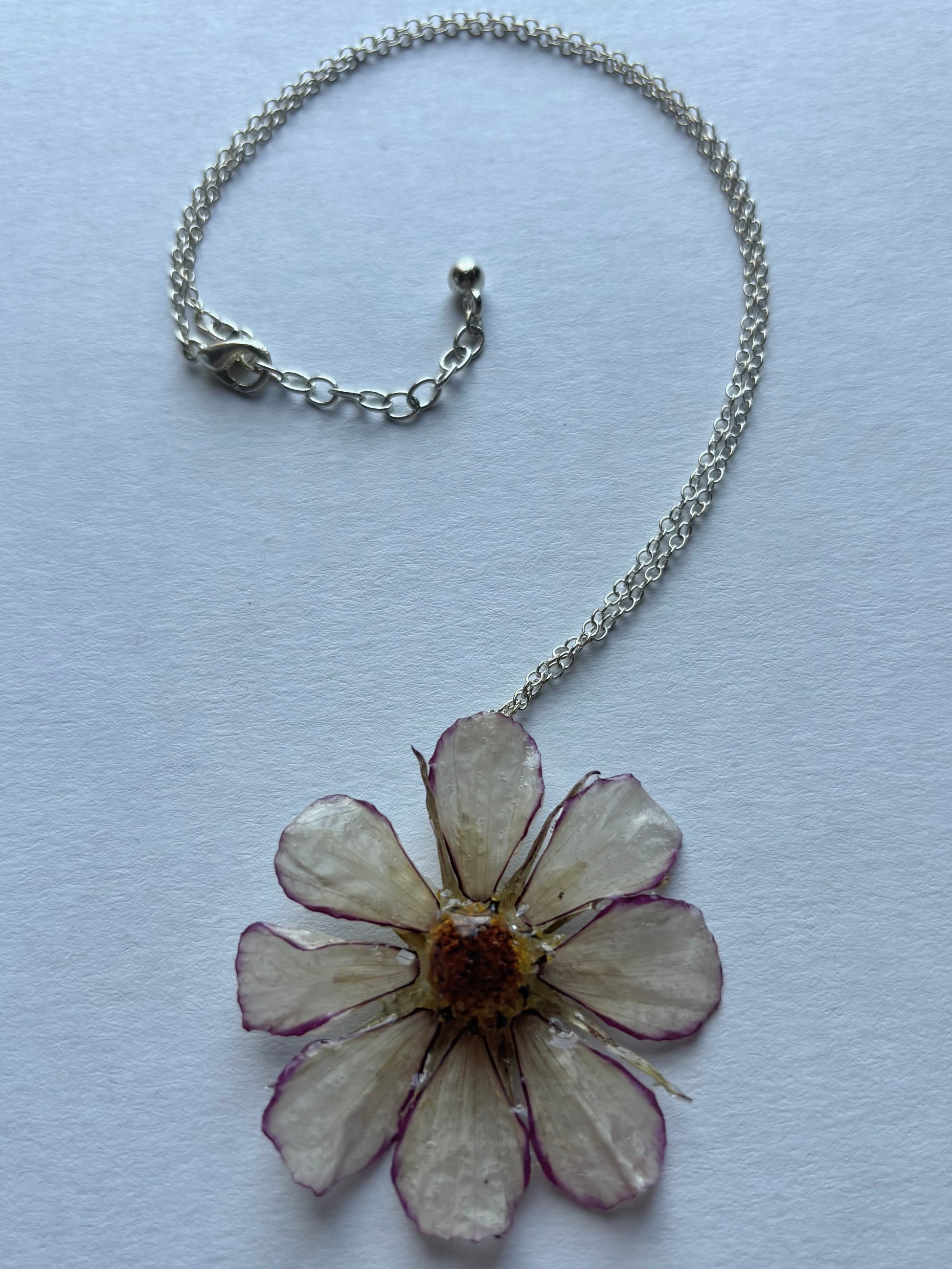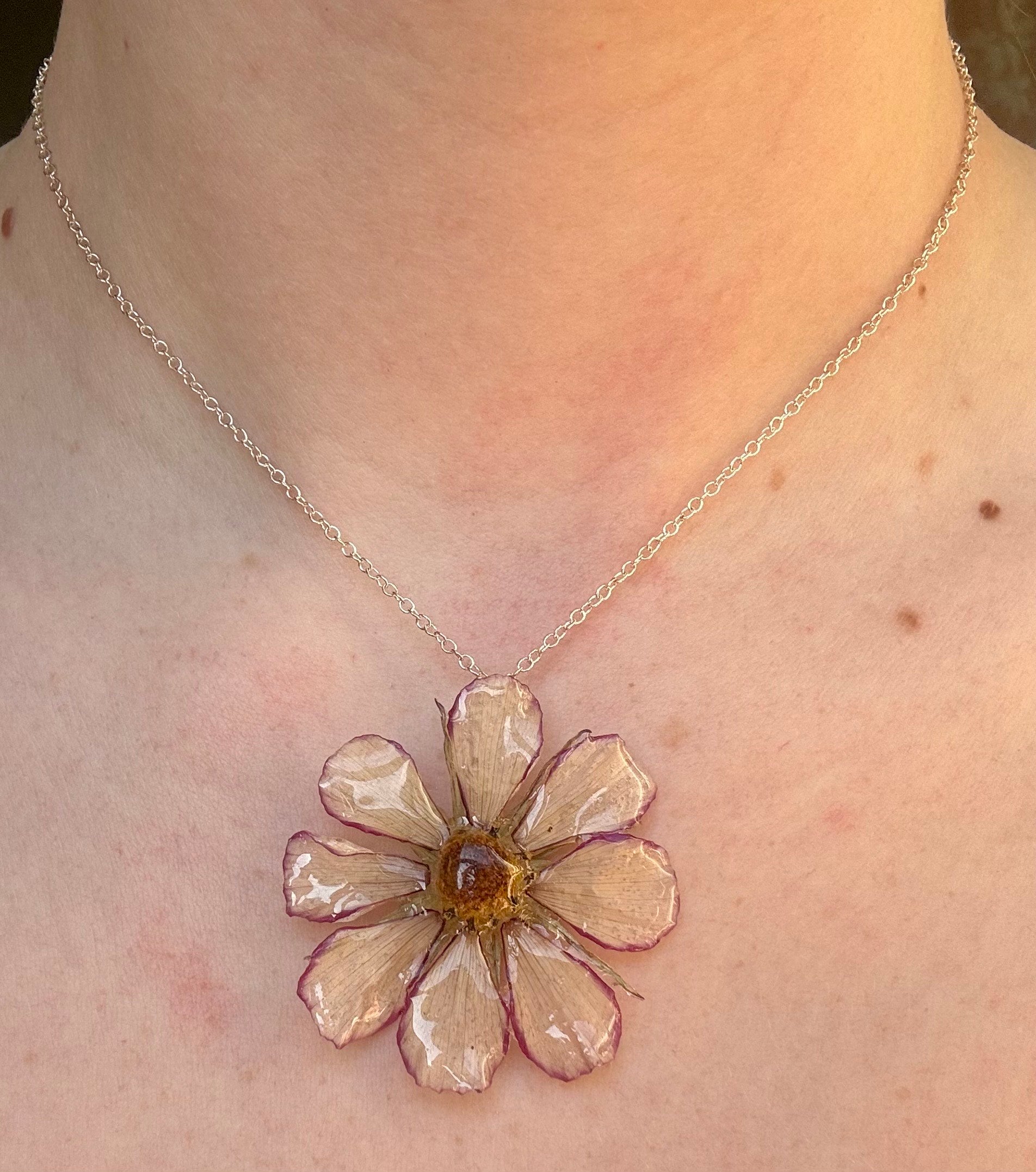 Yes! its a real preserved Cosmo. Lovingly 3D dried and coated in UV resin, with a silver plated chain and findings.