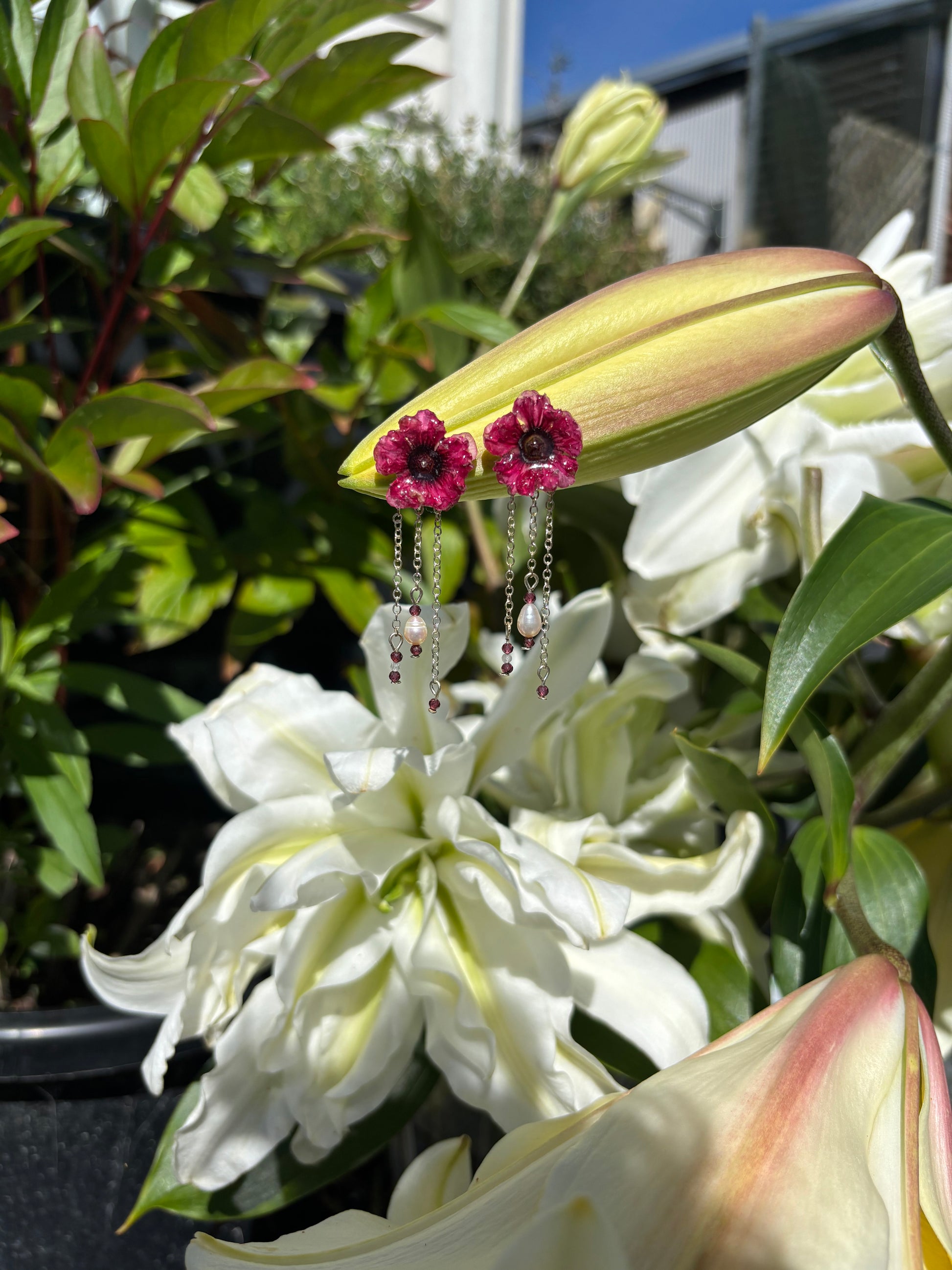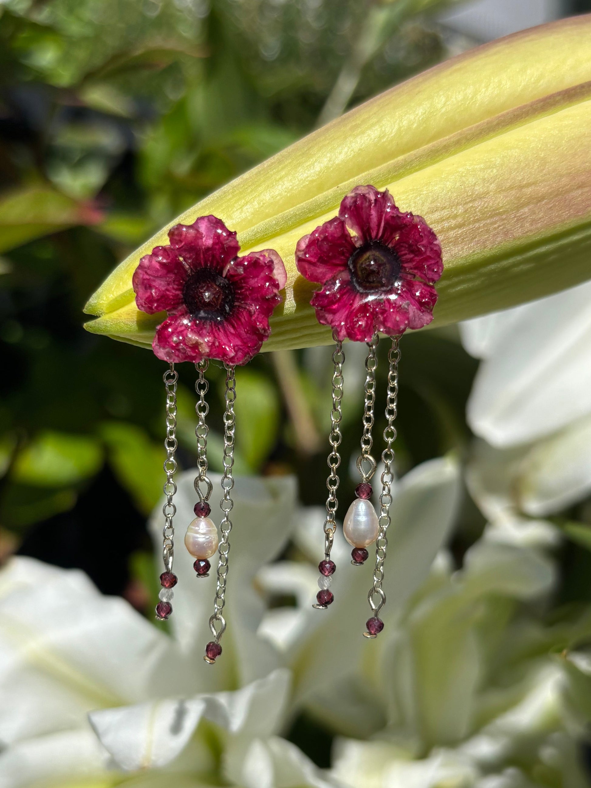 Yes! these are real preserved Manuka flowers. Lovingly 3D dried and coated in UV resin - fresh water pearls, rhodochrosite and moonstone with silver plated chain and stainless steel studs.